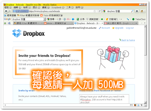 怎麼辦呢?嗯,你可以花錢昇級容量 (不便宜),或是多申請幾個帳號 (使用時不便),要不然就是把 Dropbox 推薦給朋友,每多一個朋友申請 Dropbox,我們的 Dropbox 空間就多一些容量可以使用。